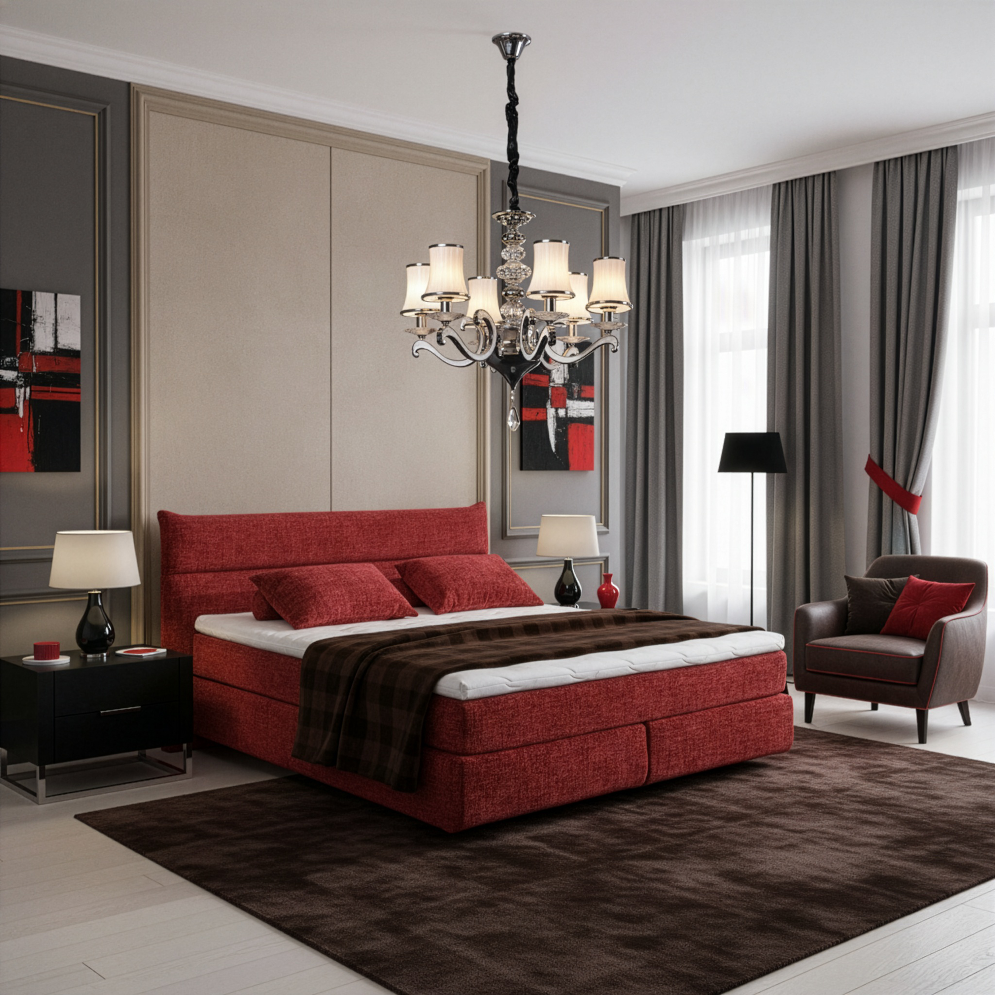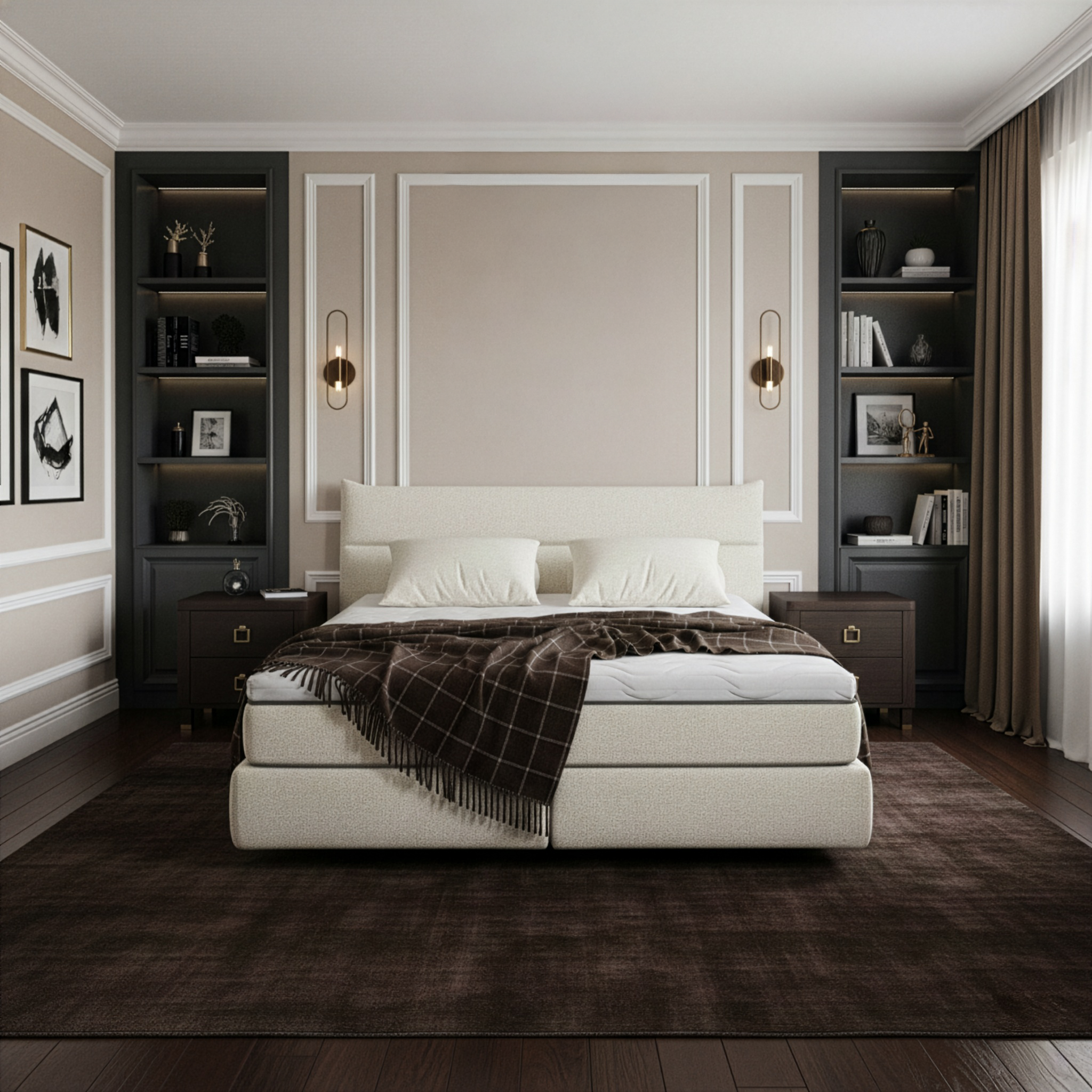 The Sandro bed focuses on clean volume, stable lines, and a unified fabric body. The headboard is built as a broad, cushioned panel that keeps a consistent visual plane without ornament. The base follows the same geometry, which creates a single continuous block around the mattress. The structure delivers uniform support and a calm presence in the room.