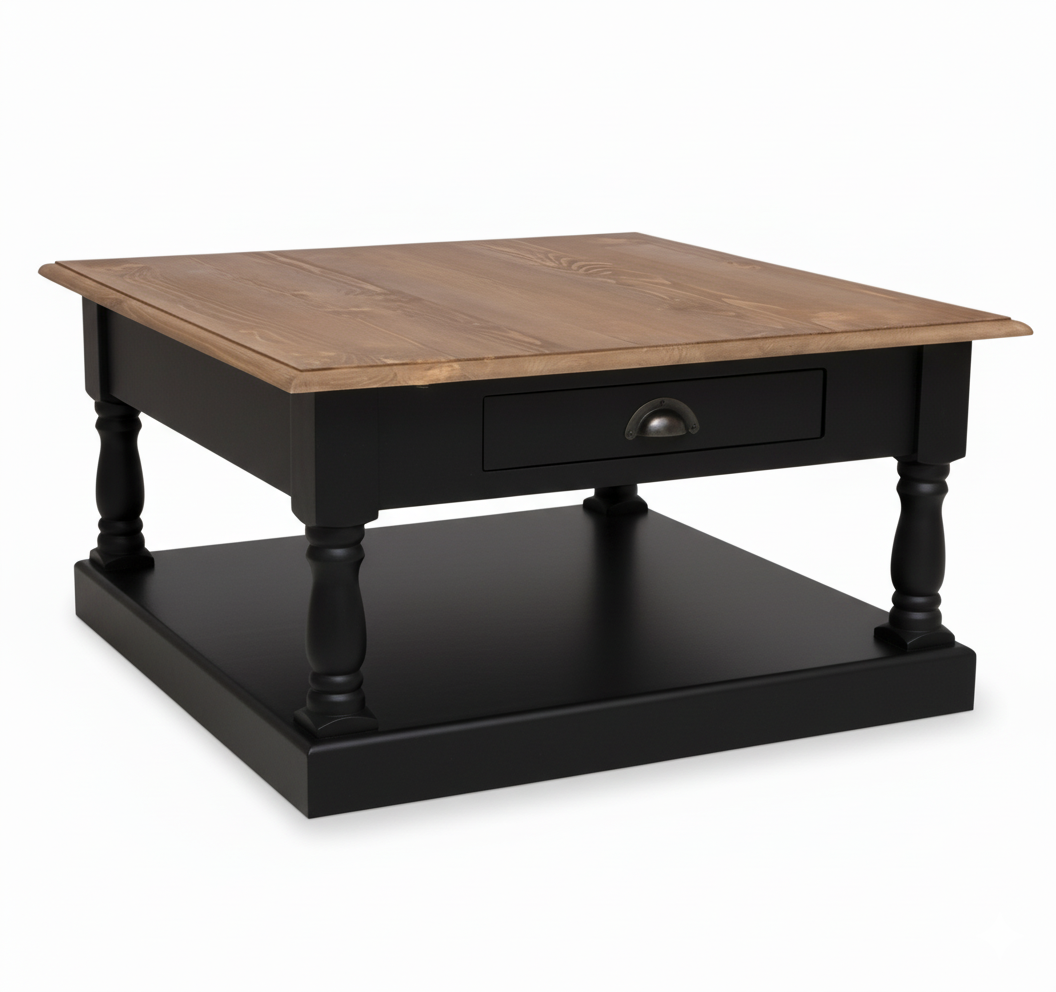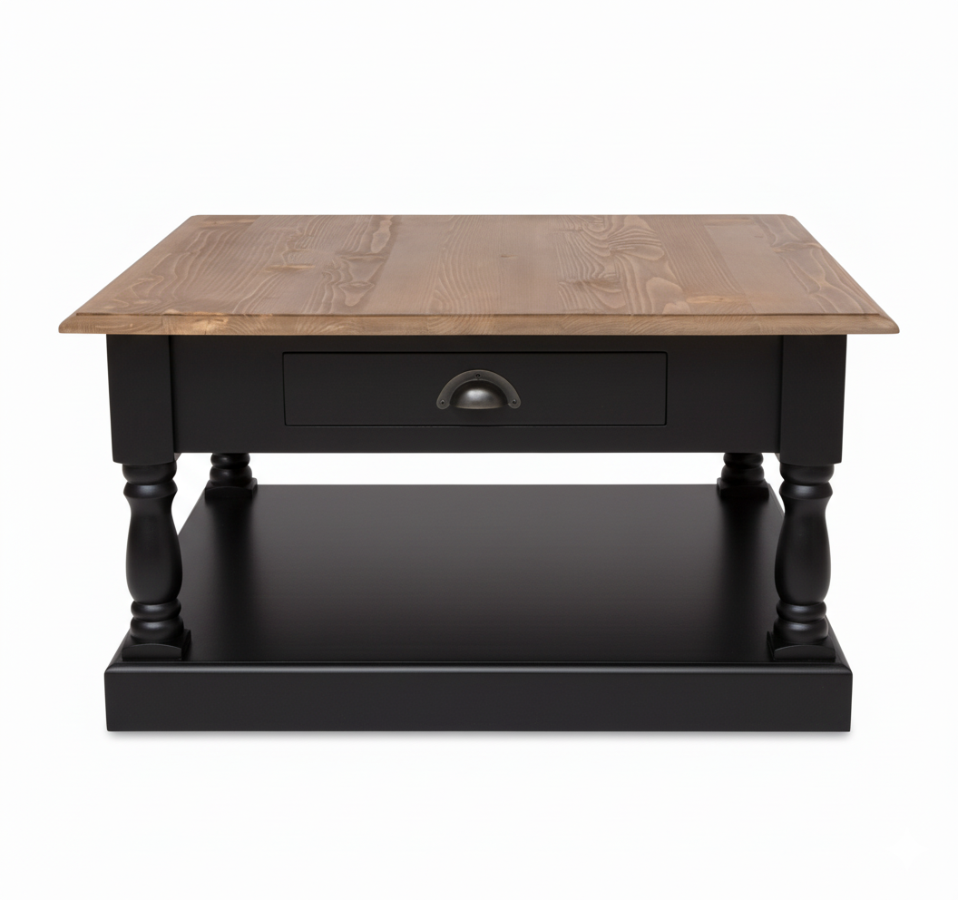 This table is as functional as it is beautiful, with a spacious drawer for storing remotes or coasters, and a sturdy lower shelf for books or decorative items. The elegant turned legs complete the classic silhouette, while the durable craftsmanship ensures this table will last for years.
