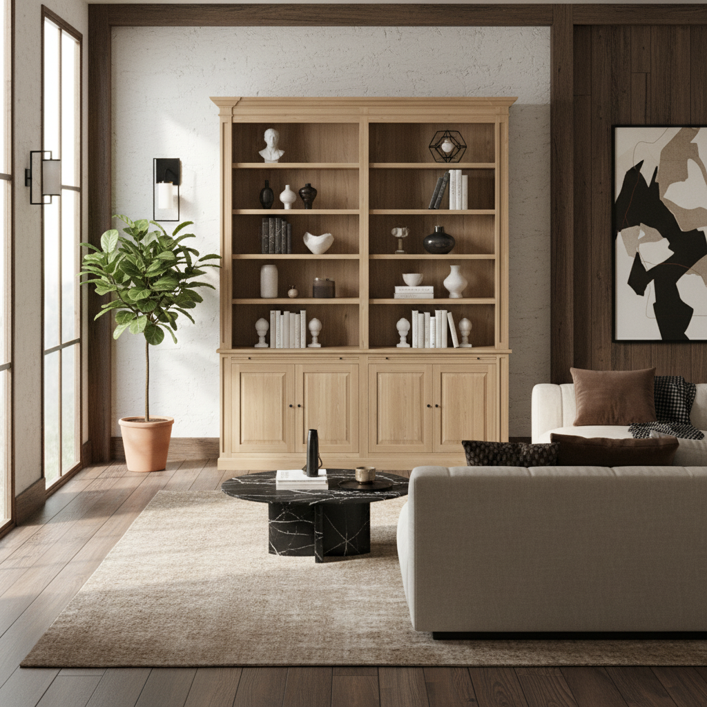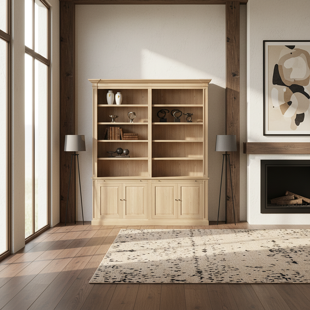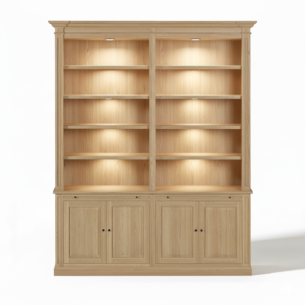 The Loire Double Bookcase is a substantial architectural storage piece designed to bring classic symmetry and practical functionality into any refined interior. Made from solid oak, it features two tall shelving sections and a full lower base with four paneled cabinet doors, offering a perfect balance of open display and enclosed storage.