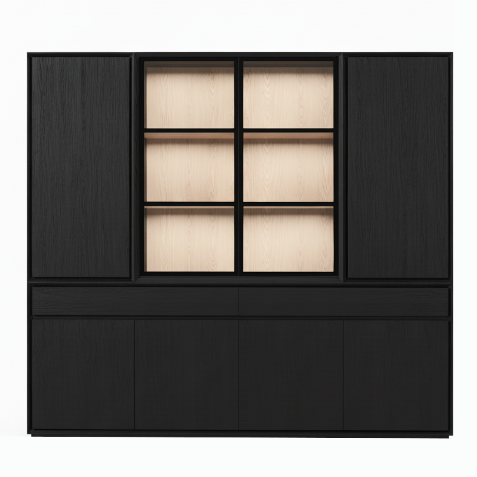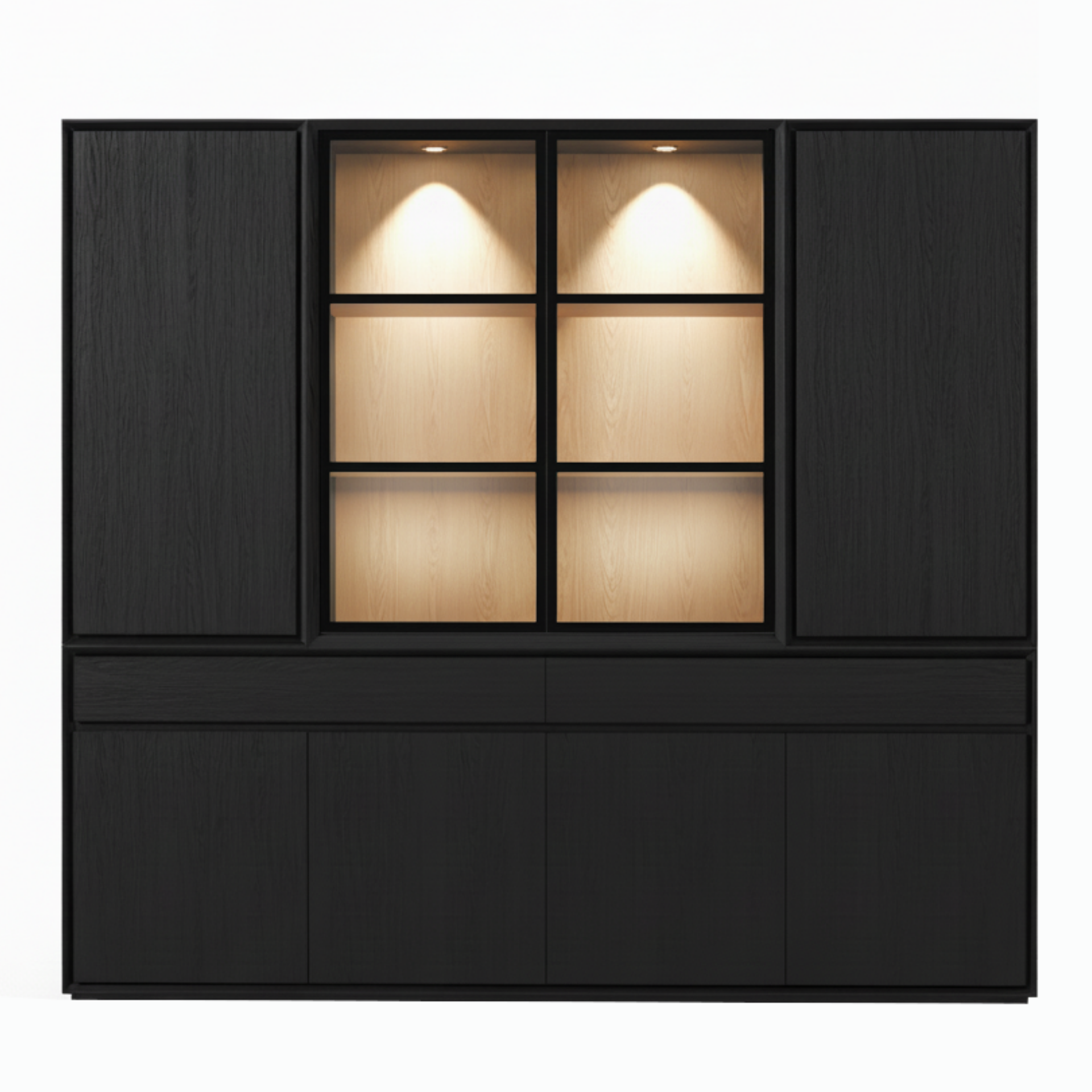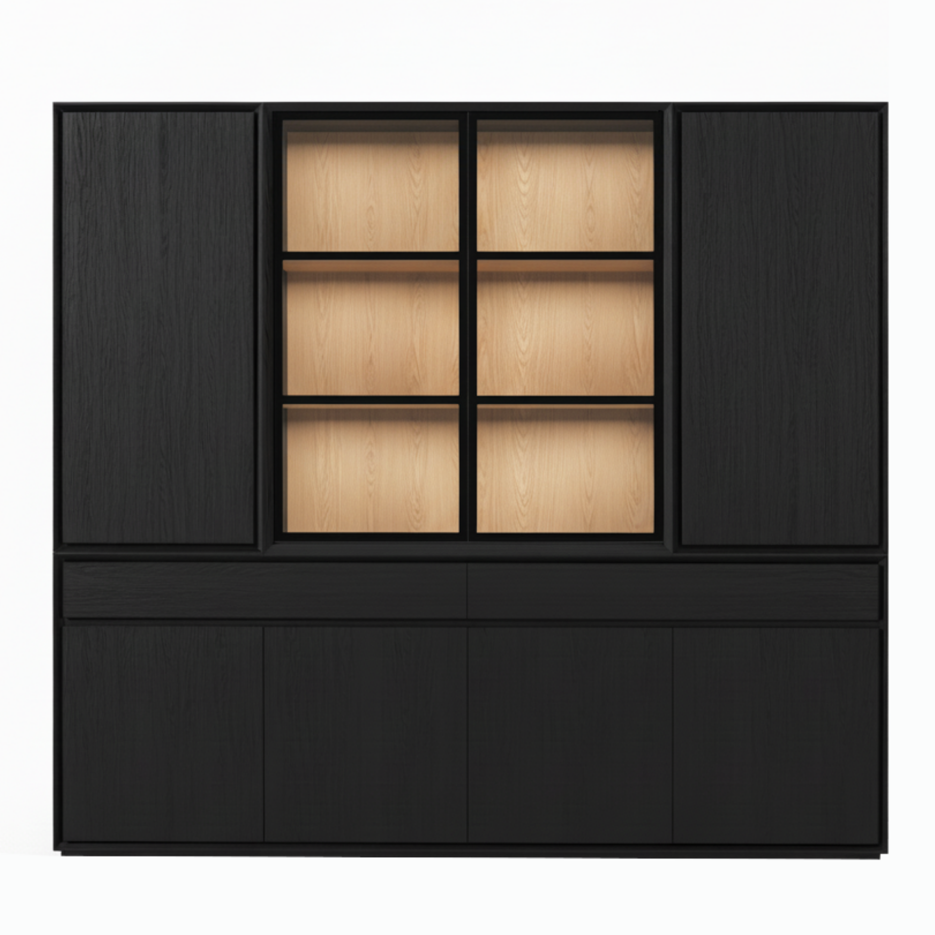 The Mezora Showcase Cabinet presents a bold architectural structure, blending clean lines with black oak surfaces. Its asymmetrical layout features three upper compartments, with a central display framed in matte black metal and glass. This striking contrast creates a visual anchor for decorative pieces or curated collections.