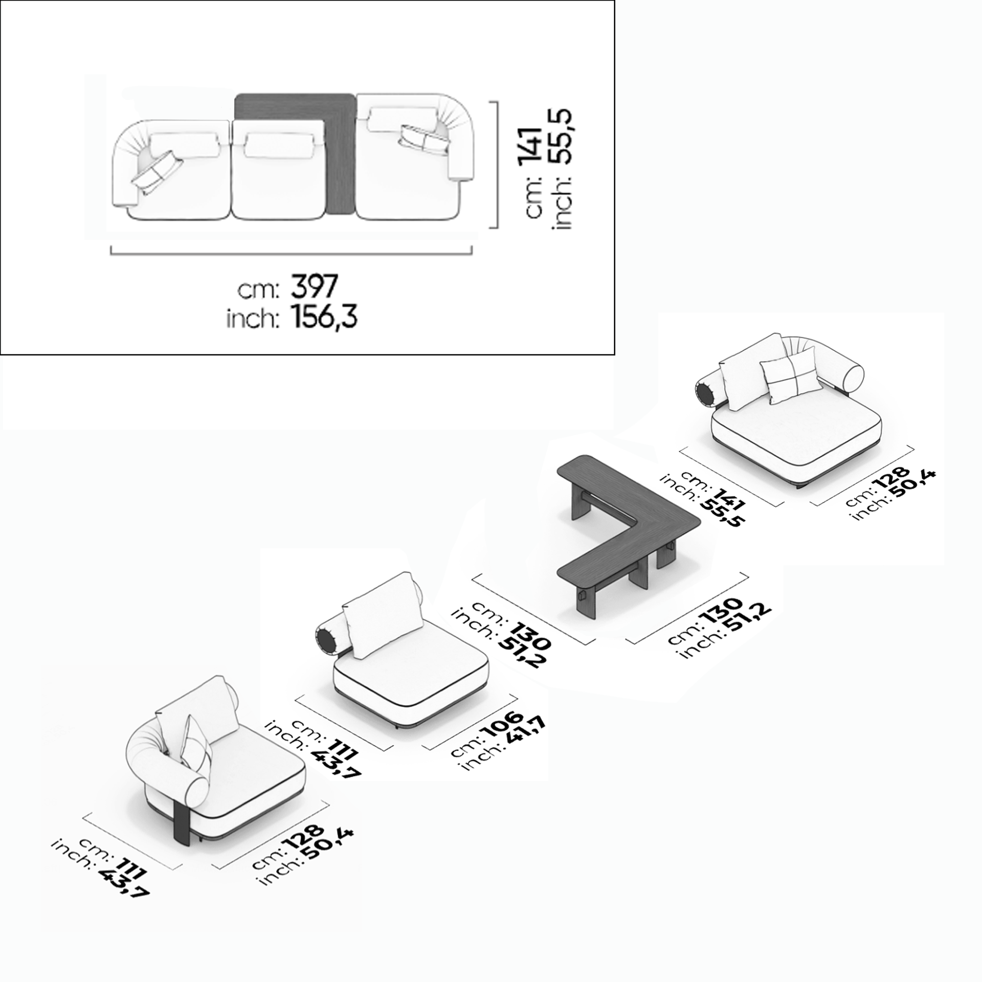With an overall footprint of 397 cm (width) × 141 cm (depth) and a seating height of 43 cm, Kyoto’s design blends clean geometry with plush comfort. The system includes three deep lounge modules, flanked by two sculptural armrests, and accented by a central integrated table.