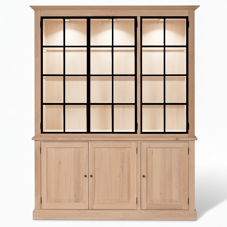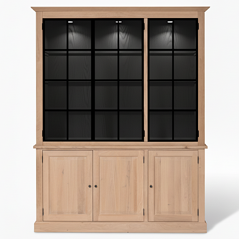 The upper display section provides deep shelving ideal for showcasing ceramics, books, glassware or collected objects. The black grid frames on the glass panels add modern contrast while reinforcing the cabinet’s vertical lines. Behind the lower oak doors, adjustable shelving allows for flexible concealed storage.